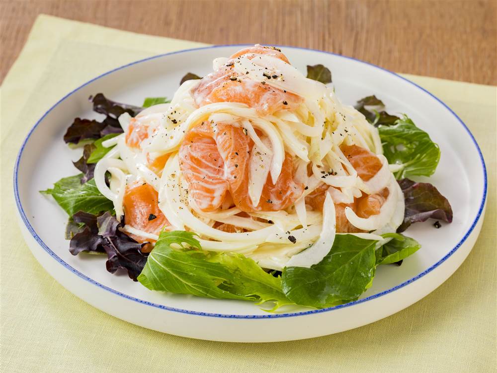 新玉ねぎの甘みとサーモンの上品なうまみがよく合う、和えサラダです。酢酸菌GK-1マヨネーズタイプのコクとレモン汁の酸味がアクセントとなり、ベビーリーフの彩りも美しい、春の食卓を華やかに彩る一品です。