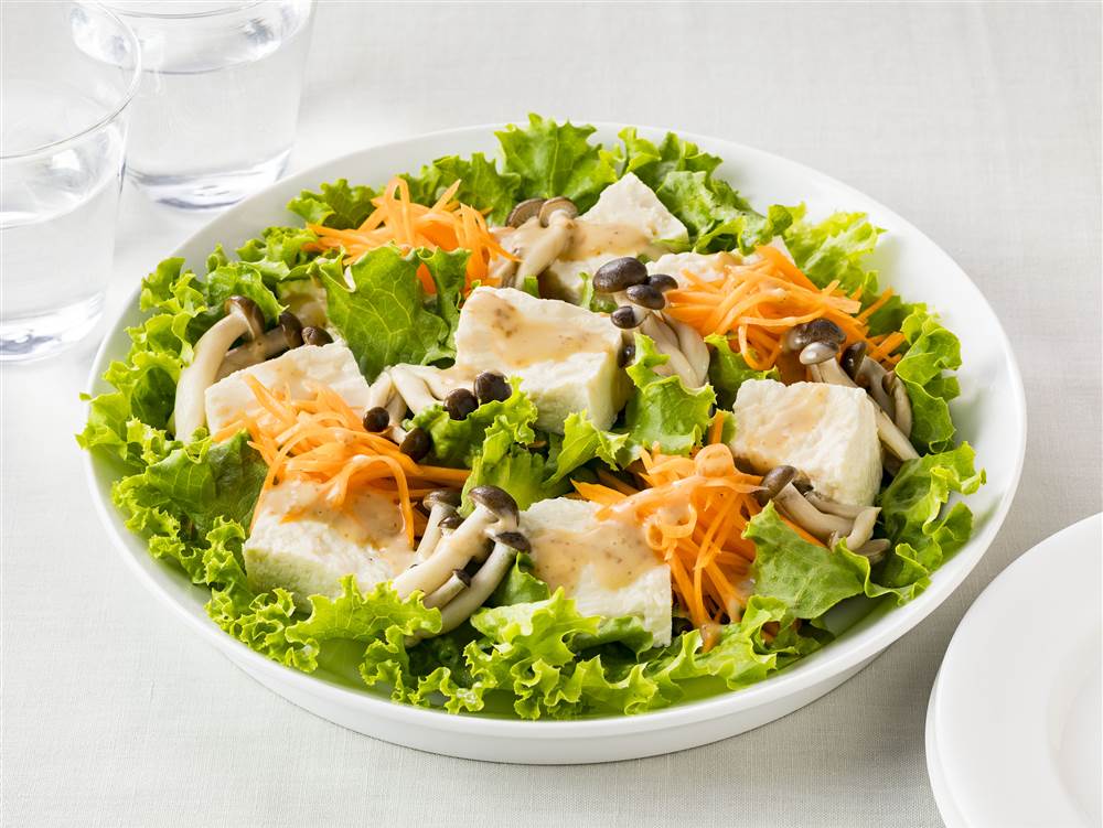 手で崩した木綿豆腐に、にんじんやきのこの食感をプラスしました。コク深いごまドレッシングで、食べ応えのある豆腐サラダです。