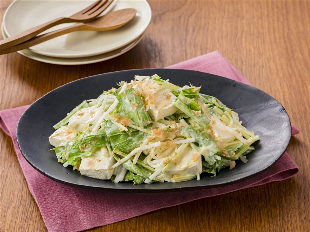シャキシャキとした大根と水菜の食感に、木綿豆腐を加えたサラダです。かつお節の風味と酢酸菌GK-1マヨネーズタイプのまろやかなコクが素材の味わいを引き立て、シンプルながらも奥行きのある味わいに仕上がります。毎日の食卓に取り入れやすい一品です。