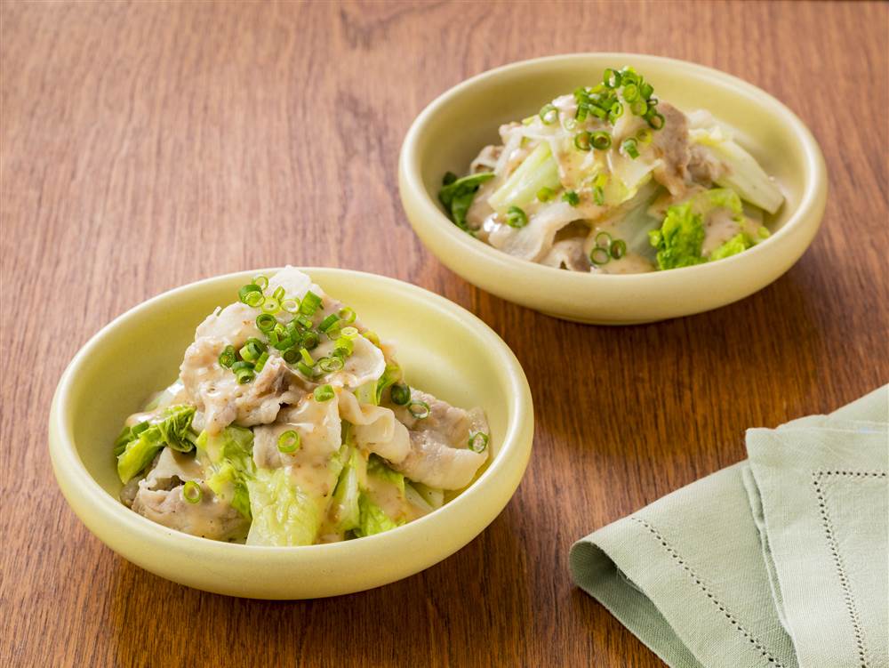 レンジで手軽に作れる蒸しサラダです。やわらかく仕上がった白菜と豚肉に、ごまドレッシングの風味がよく合います。