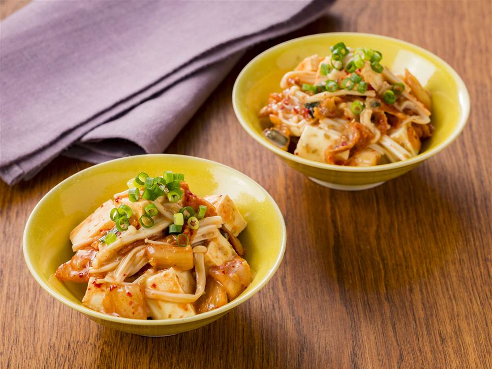 2木綿豆腐は水切りをし、ひと口大に切る。キムチは細かく切る。