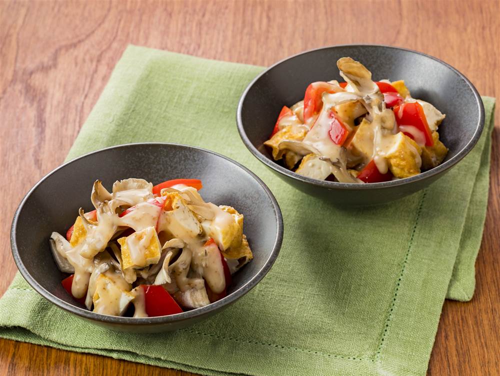レンジで手軽に作れる、あたたかいサラダです。厚揚げとまいたけを合わせることで満足感のある一皿になり、パプリカの鮮やかな彩りが食欲をそそります。