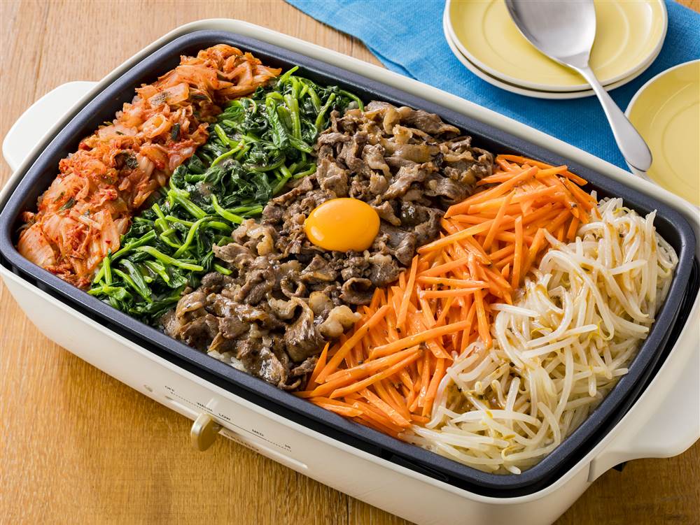 ホットプレートでかんたんにできる、ホームパーティにもおすすめのビビンバです。たれだけで味が決まります。香ばしいおこげがたのしめます。