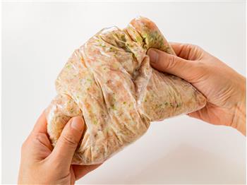 2食品用ポリ袋に①、鶏ひき肉、Aを入れ、粘りが出るまでよくもむ。食品用ポリ袋の角を1か所切る。