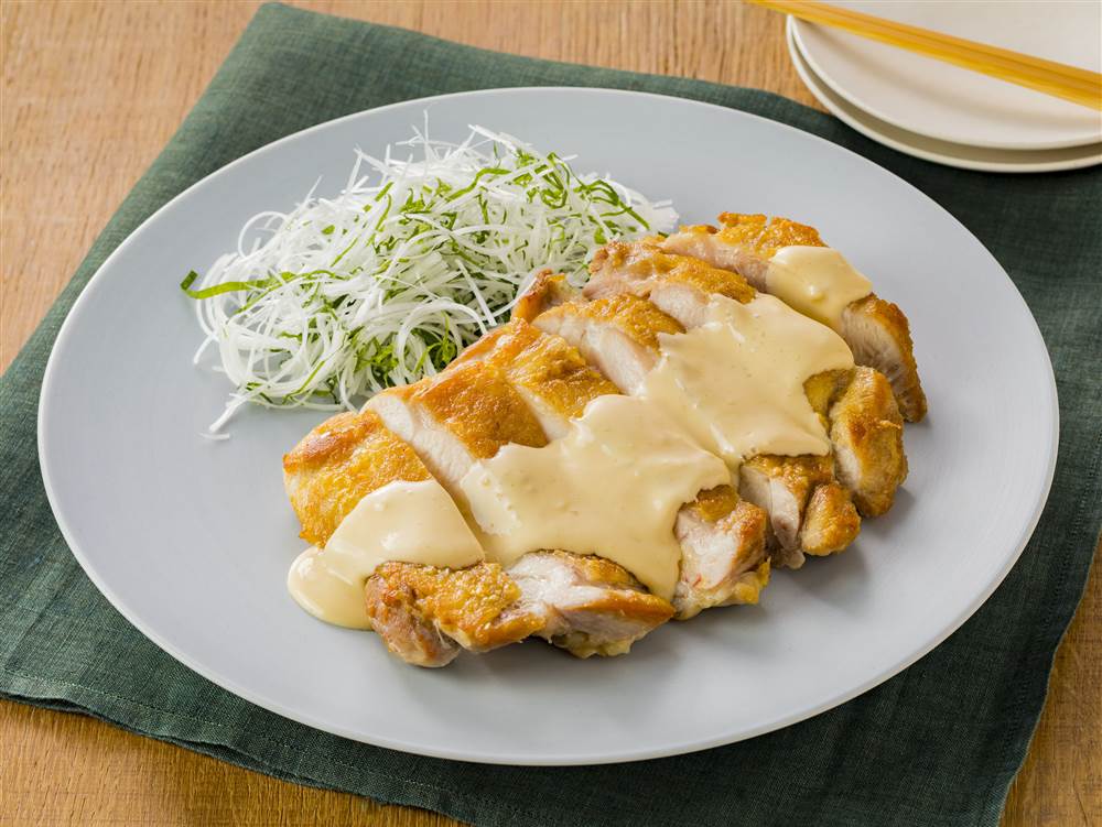 ジューシーなこんがりチキンソテーに、めんつゆのうまみとにんにくが効いたマヨネーズソースをたっぷりとかけました。つけ合わせの白髪ねぎのシャキシャキ感と青じそのさわやかな風味がアクセントとなり、ご飯がすすむ和風のチキンソテーです。