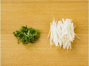3長ねぎは白髪ねぎにし、水にさらして水気をきる。青じそはせん切りにする。白髪ねぎと青じそを合わせる。
