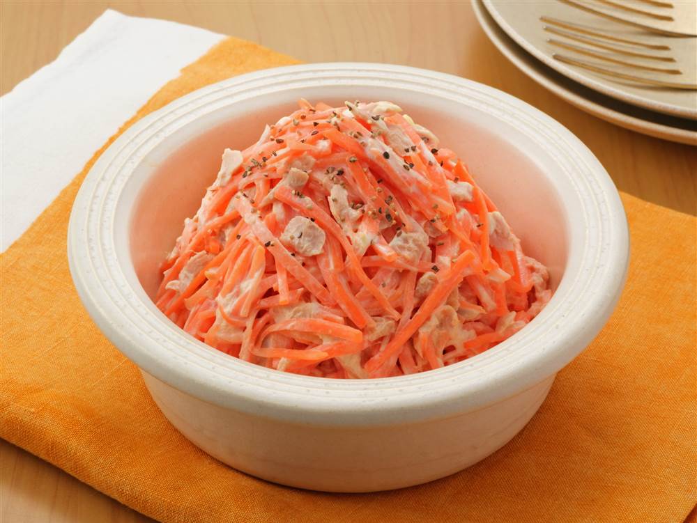 せん切りにんじんとツナをキユーピーハーフでしっかりと和えた、シンプルで食べやすいデリ風サラダです。黒こしょうがアクセントになります。